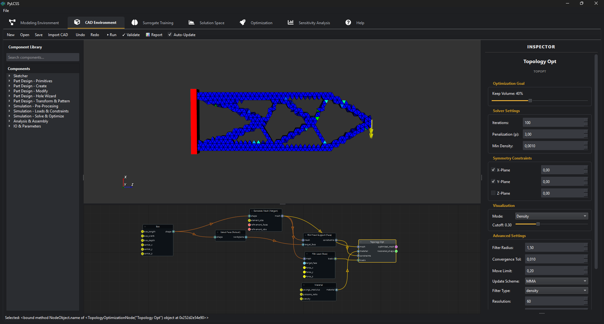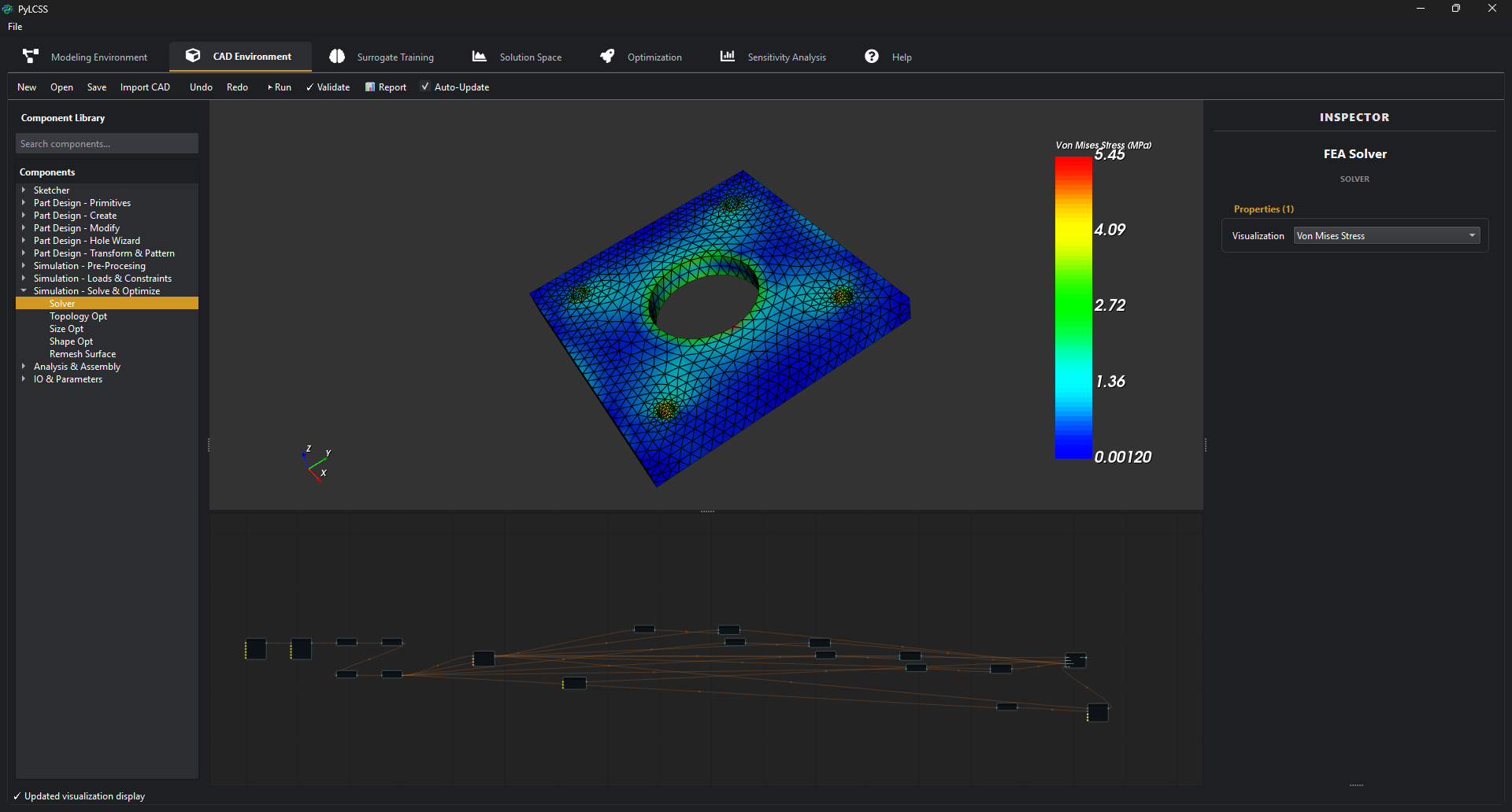 https://github.com/kutaydemir07/PyLCSS PyLCSS (Python Low-Code System Solutions) is a professional engineering design platform. It allows engineers to model complex multidisciplinary systems through a node-based visual interface, run parametric CAD and FEA simulations, explore high-dimensional Solution Spaces, and optimise designs using 7 different algorithms — all within a single desktop application.