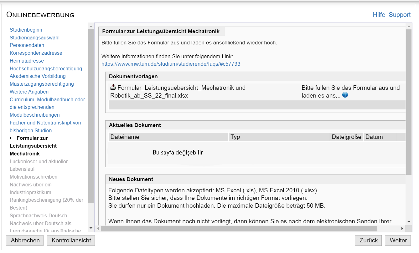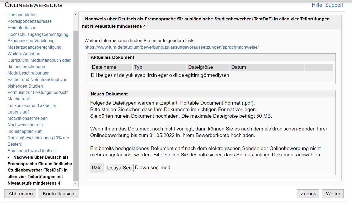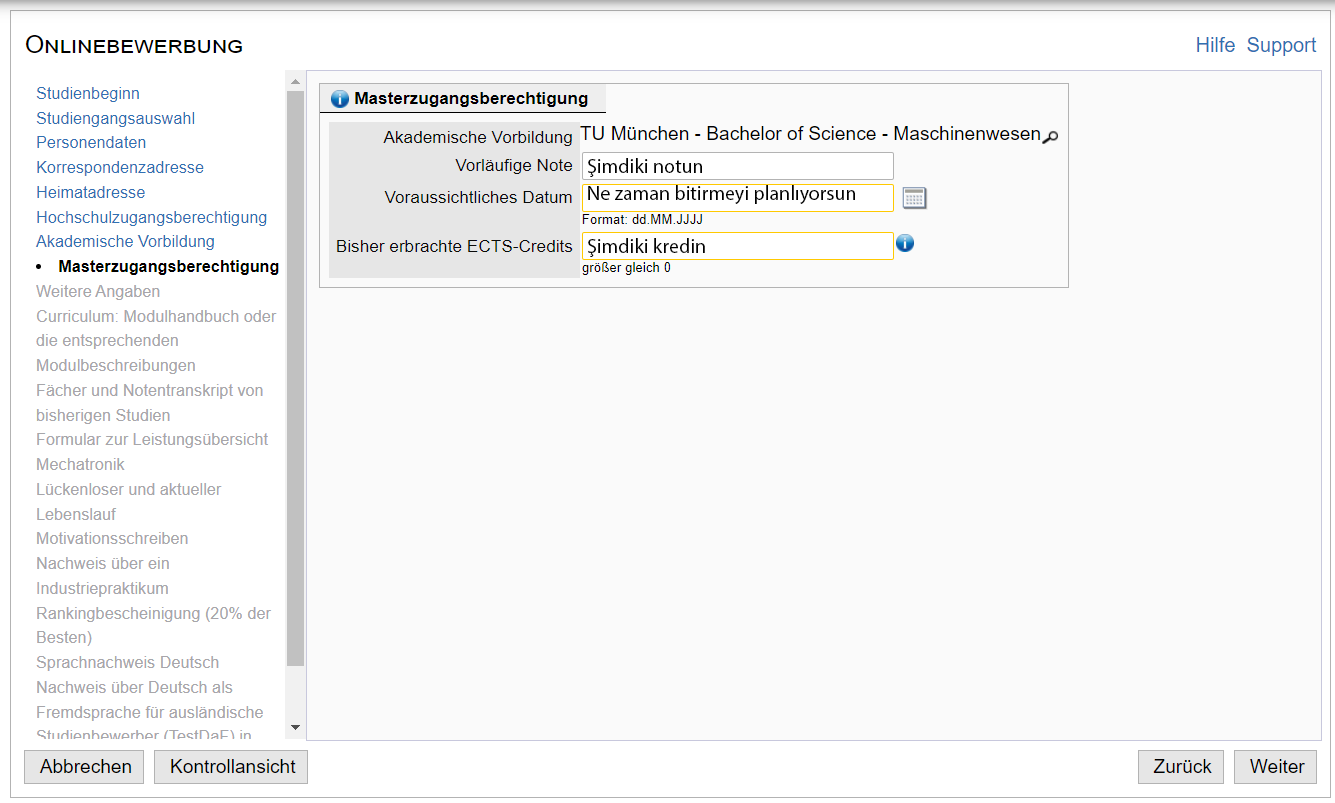 TUM’da lisans okuyup ardından yüksek lisans okumak isteyenler fotoğraftaki yorumları okuyabilir diğer yerlerden başvuranlar için bazı yerler otomatik doldurulmuş olmayabilir. Bu resimdeki sayfalar TUM’daki Master programlarına göre değişiklik gösterebilir. Diğer yazıda daha detaylı bilgiler bulabilirsiniz. Bu yazı genel olarak lisansta makine okuyup makine benzeri (Maschinenwesen, Aerospace, Automotive Engineering, Energie und Prozesstechnik, Entwicklung, Produktion und Management, Mechatronik und Robotik…) yüksek lisans programlarına başvuranlar için geçerlidir.