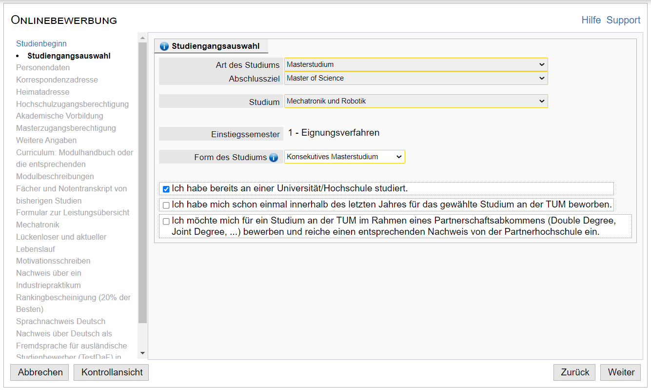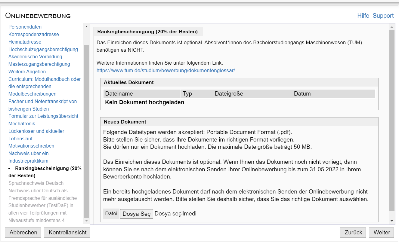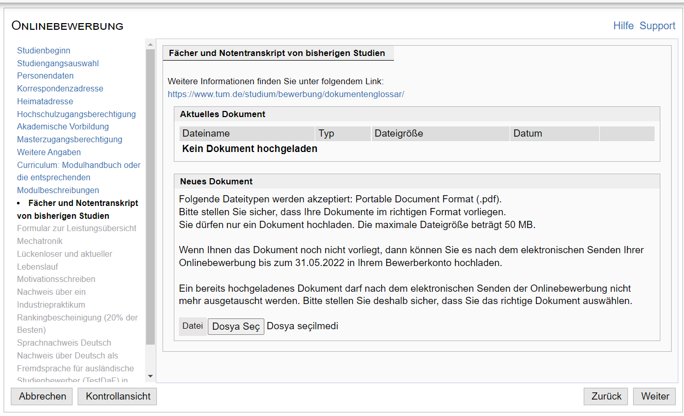 TUM’da lisans okuyup ardından yüksek lisans okumak isteyenler fotoğraftaki yorumları okuyabilir diğer yerlerden başvuranlar için bazı yerler otomatik doldurulmuş olmayabilir. Bu resimdeki sayfalar TUM’daki Master programlarına göre değişiklik gösterebilir. Diğer yazıda daha detaylı bilgiler bulabilirsiniz. Bu yazı genel olarak lisansta makine okuyup makine benzeri (Maschinenwesen, Aerospace, Automotive Engineering, Energie und Prozesstechnik, Entwicklung, Produktion und Management, Mechatronik und Robotik…) yüksek lisans programlarına başvuranlar için geçerlidir.